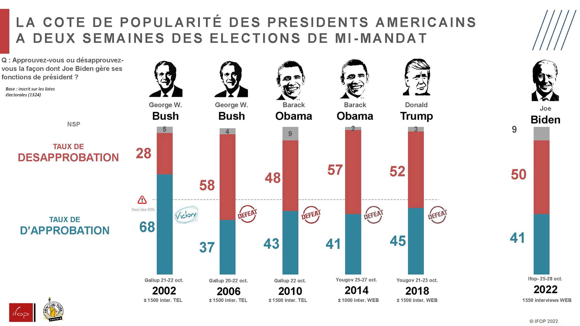 Alors que les élections de mi-mandat sont généralement défavorables au camp du président, ce scrutin arrive dans un contexte où la cote de popularité de Joe Biden ne peut que plomber les chances de ses candidats : à peine 41% des électeurs américains approuvent la façon dont il gère ses fonctions de président, soit nettement en deçà du taux de popularité du dernier président ayant réussi l’exploit de gagner les « midterms » (George W. Bush, 68% en octobre 2002 selon Gallup).