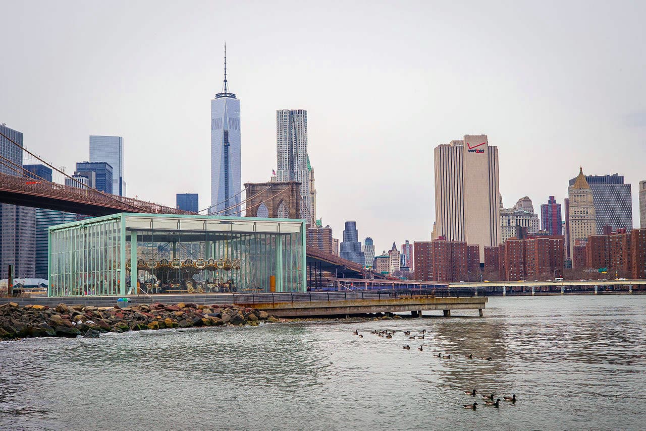 Le Jane’s Carousel est de loin le manège le plus connu de New York et offre une vue imprenable sur le pont de Brooklyn et la skyline de la pointe de Manhattan (Financial District).