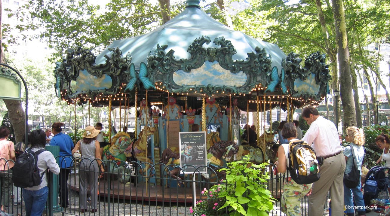Bryant Park possède également un nombre important d’installations qui vous permettront de jouer aux échecs, de faire du manège dans le carrousel installé côté 40ème rue, un terrain de pétanque (le long de l’Avenue of the Americas), des tables de ping pong…