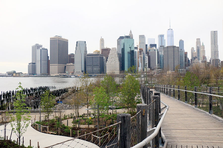 Ce pont permet d’accéder au Brooklyn Bridge Park et plus particulièrement au Old Pier 1. C’est un passage très bien aménagé : verdure de chaque côté et promenade en bois.