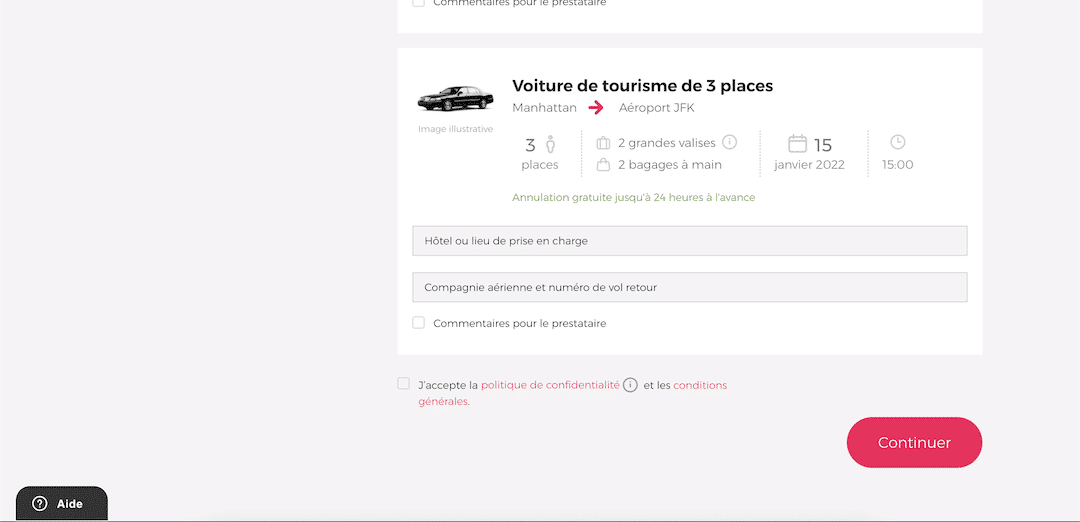 Une fois votre véhicule choisi, vous arriverez ensuite sur cette page. Vous verrez le récapitulatif de votre trajet sur la gauche avec le détail de prix de l’aller et du retour (si c’est ce que vous avez choisi comme option).